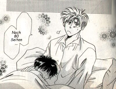 Der japanischen Sprache unwissend, wälzt sich der stolze Besitzer durch seine Errungenschaften, überhäuft das Herz mit "sich in Laken wälzenden" und "melancholisch sülzenden" Zeichnungen von Epheben besonderer Art. Vor allem, da sich diese Protagonisten für den Podex des gleichen Geschlechts interessieren! Dem Despot zufolge könnten ruhig alle männlichen Wesen (in den Geschichten) nur vom gleichen Geschlecht zu erregen sein, egal, ob es nur unwichtige Nebenpersonen sind, die vielleicht nur ein Panel lang zu sehen waren und somit ihr Schicksal auferlegt bekamen, doch etwas mit dem anderem zu haben. Selber Schuld, warum schauen die auch alle so verdammt süss aus?!